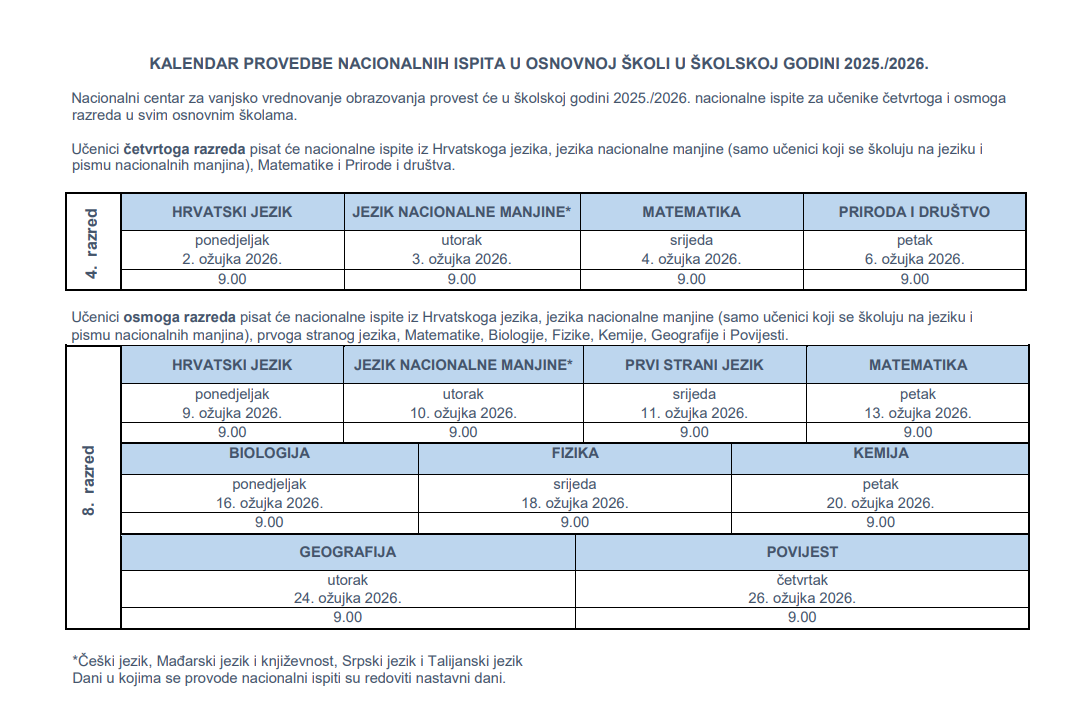 I školske godine 2025./2026. nacionalne ispite pisat će svi učenici četvrtog i svi učenici osmog razreda osnovnih škola. Nacionalni centar za vanjsko vrednovanje obrazovanja koji ih provodi već je objavio datume njihova polaganja. Četvrtaši pišu ispite iz triju predmeta i to od 2. do 6. ožujka 2026., a osmaši polažu osam ispita od 9. ožujka do 26. ožujka 2026.